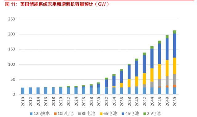 目前美國用戶側(cè)儲能的滲透率較低,由于獨立住宅數(shù)量大,市場遠(yuǎn)未飽和,且用戶側(cè)儲能自發(fā)自用, 經(jīng)濟性強,用電可靠性增加,未來市場巨大。長期來看,根據(jù) NREL 預(yù)測,2050 年美國儲能總裝 機將超過200GW,雖然目前抽水蓄能占據(jù)了九成左右的市場,未來電化學(xué)儲能是主要的增長動力, 其中當(dāng)前新增裝機以 2h 和 4h 儲能系統(tǒng)為主,未來逐漸向長時儲能發(fā)展,以 4h 和 6h 儲能系統(tǒng)為 主。