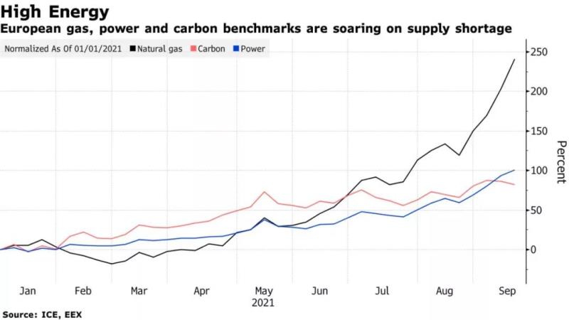 隨著各國(guó)從疫情大流行中復(fù)蘇,在能源供應(yīng)短缺的情況下需求增加,導(dǎo)致能源價(jià)格暴漲。很多煤電廠已經(jīng)關(guān)閉,天然氣庫(kù)存很低,歐洲大陸對(duì)可再生能源的日益依賴(lài)暴露了新能源系統(tǒng)的脆弱性。即使在天氣溫和的9月,天然氣和電力價(jià)格打破了整個(gè)歐洲大陸的紀(jì)錄。預(yù)計(jì)電力價(jià)格將在第三季度增長(zhǎng)40%。