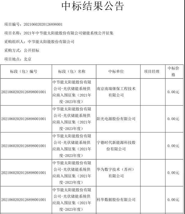 中節(jié)能太陽(yáng)能股份有限公司2021年度-2023年度儲(chǔ)能系統(tǒng)供應(yīng)商中標(biāo)結(jié)果公示,共有10家企業(yè)獲得中標(biāo)!中標(biāo)企業(yè)名單如下: