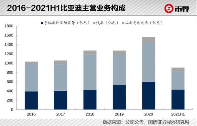 查看比亞迪的業(yè)務(wù)構(gòu)成,你會發(fā)現(xiàn)很難定義這是一家車企還是一家手機(jī)代工企業(yè),此外,其電池業(yè)務(wù)占據(jù)的份額也在緩慢提升。