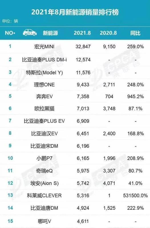 從具體車型來看,在8月新能源銷量排行榜中,比亞迪秦PLUS DM-i沖到了第二位,僅次于爆款車型五菱宏光MINI,超過了特斯拉Model Y。