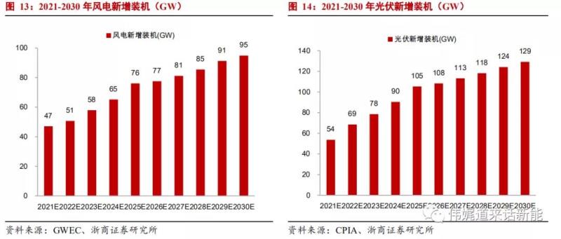 我們認(rèn)為在雙碳政策支持、產(chǎn)業(yè)經(jīng)濟(jì)性突出的背景下,2030年全國(guó)非化石能源消費(fèi)占一次能源比例有望達(dá)到28%,測(cè)算“十四五”期間風(fēng)電和光伏以及儲(chǔ)能將分別實(shí)現(xiàn)年均新增裝機(jī)59GW、79GW以及22.6GWh。