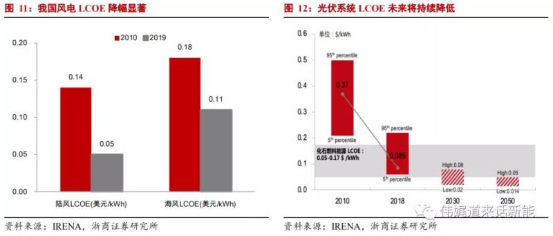 風(fēng)電方面,根據(jù)IRENA 統(tǒng)計(jì),截止 2019 年,我國(guó)陸/海風(fēng)的 LCOE 已經(jīng)由 2010 年的 0.14/0.18 美元/kWh下降到了 0.05/0.11 美元/kWh,降幅分別為 66%和 37%。另外根據(jù)今年 6 月發(fā)改委發(fā)布的《關(guān)于 2021 年新能源上網(wǎng)電價(jià)政策有關(guān)事項(xiàng)的通知》,我國(guó)新核準(zhǔn)的陸風(fēng)項(xiàng)目平價(jià)上網(wǎng),海風(fēng)項(xiàng)目也有望在十四五期間實(shí)現(xiàn)平價(jià)。光伏方面,當(dāng)前國(guó)內(nèi)光伏項(xiàng)目 LCOE 已降至0.25-0.35 元/kWh,基本實(shí)現(xiàn)平價(jià);全球光伏 2018 年 LCOE 均值為 0.085 美元/kWh,且據(jù)IRENA 預(yù)測(cè),未來(lái)全球光伏 LCOE 仍有 30-50%降本空間。