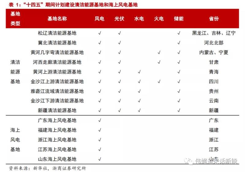 根據(jù)新華社公布的《中華人民共和國(guó)國(guó)民經(jīng)濟(jì)和社會(huì)發(fā)展第十四個(gè)五年規(guī)劃和2035年遠(yuǎn)景目標(biāo)綱要》,為大幅提升風(fēng)電、光伏的發(fā)電規(guī)模,構(gòu)建各類電源協(xié)調(diào)互補(bǔ)的現(xiàn)代化清潔能源體系,未來(lái)我國(guó)將持續(xù)開發(fā)包括水電、風(fēng)電、光伏等電源在內(nèi)的多個(gè)清潔能源基地,進(jìn)而形成9大集風(fēng)光(水火)儲(chǔ)于一體的大型清潔能源基地以及5大海上風(fēng)電基地。