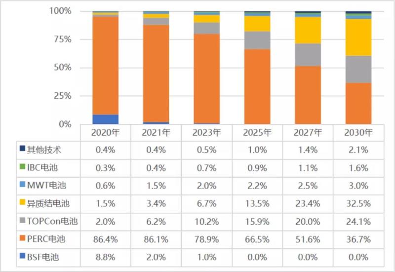 根據中國光伏行業(yè)協(xié)會發(fā)布的《中國光伏產業(yè)發(fā)展路線圖(2020版)》,2020年,新建量產產線仍以PERC電池產線為主,隨著PERC電池片新產能持續(xù)釋放,PERC電池片市場占比進一步提升至86.4%,n型電池(主要包括異質結電池和TOPCon電池)相對成本較高,量產規(guī)模仍較少,目前市場占比約為3.5%,但是隨著TOPCon、HJT 等電池效率和成本優(yōu)勢不斷改善,n型電池市場占比將逐步提升,行業(yè)產業(yè)化進程加速推進。在以 TOPCon、HJT 為代表的 n 型電池技術路線效率成本占優(yōu)的情況下,n 型電池技術路線領先優(yōu)勢將迅速確立,形成對傳統(tǒng)技術的替代趨勢。