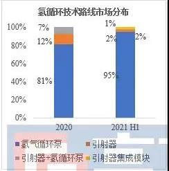 在實際使用中,氫循環(huán)解決方案需要滿足不斷拓展的燃料電池應(yīng)用要求,同時還要綜合考慮氫循環(huán)部件技術(shù)成熟度、成本等多種因素,因此近年來國內(nèi)市場氫循環(huán)解決方案在不斷發(fā)生變化,新供應(yīng)商和新解決方案不斷涌現(xiàn)。2020年與2021H1氫循環(huán)技術(shù)路線市場分布如下: