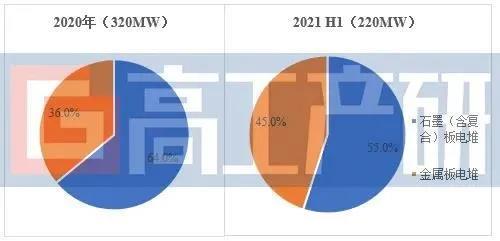 從電堆類型來看,今年金屬板電堆出貨比重進一步增加。2021年H1已出貨電堆中,石墨(含復(fù)合)板電堆占比55%,金屬板電堆占比45%。預(yù)計2021年全年金屬板電堆有望與石墨(含復(fù)合)板電堆平分市場。