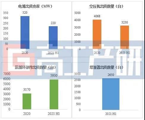 今年上半年,燃料電池系統(tǒng)四大核心部件的出貨量均超預(yù)期。高工產(chǎn)研氫電研究所(GGII)調(diào)研數(shù)據(jù)顯示,2021 H1中國氫燃料電池電堆出貨功率為220MW,約占2020年全年出貨功率的70%;氫循環(huán)部件出貨量為5930臺,出貨量為去年數(shù)量的1.5倍;空壓機出貨量為3230臺,接近2020年全年出貨量的80%;增濕器出貨超2500臺。