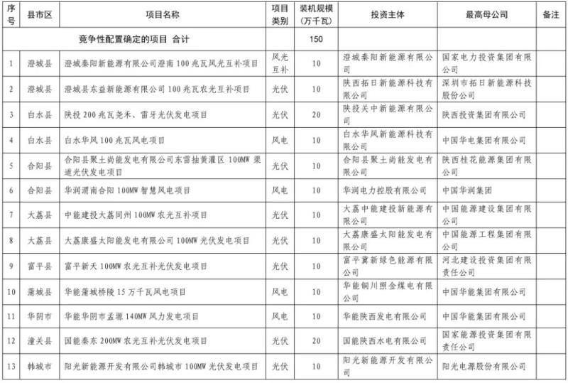 9月23日,陜西省能源局發(fā)布《關(guān)于渭南市新能源基地風(fēng)電光伏發(fā)電項目配置結(jié)果》的公示。
