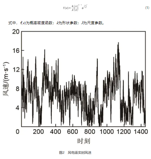 為了分析每小時(shí)風(fēng)力輸出,本研究采集了2019年夏縣2個(gè)月間的風(fēng)電場(chǎng)實(shí)時(shí)風(fēng)速,如圖2所示。顯然,風(fēng)力輸出是不確定的,為了建立確定性風(fēng)力輸出模型,區(qū)別于使用具有加權(quán)因子的5個(gè)代表日,或采用高斯法擬合風(fēng)力發(fā)電數(shù)據(jù)構(gòu)建隨機(jī)模型。本文使用廣泛應(yīng)用于處理不確定性風(fēng)力問題的威布爾(Weibull)概率分布函數(shù)[10]進(jìn)行建模,其數(shù)學(xué)表達(dá)式見式(1)