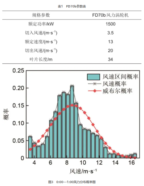 風(fēng)電場(chǎng)使用的設(shè)備為FD70b風(fēng)力渦輪機(jī),其參數(shù)見表1。建模方法如下,以第1小時(shí)為例,首先依照標(biāo)準(zhǔn)IEC61400—12—1,將每天0:00—1:00時(shí)處于切入切出風(fēng)速間的有效風(fēng)力數(shù)據(jù)進(jìn)行匯總;然后,采取風(fēng)速區(qū)間法(Bin法)以0.5 m/s的整倍數(shù)為中心劃分區(qū)間并逐區(qū)計(jì)算其概率密度;最后,匯總上述數(shù)據(jù)估計(jì)概率曲線的參數(shù),進(jìn)而建立威布爾分布曲線。圖3為0:00—1:00時(shí)風(fēng)力分布概率圖,在該時(shí)段λ=9.5066、k=3.7573的威布爾分布可以很好地?cái)M合風(fēng)力的變化,初步驗(yàn)證了Weibull分布建模的可靠性。因此,要基于威布爾概率分布構(gòu)建有代表性的小時(shí)風(fēng)力輸出功率曲線,主要步驟如下。