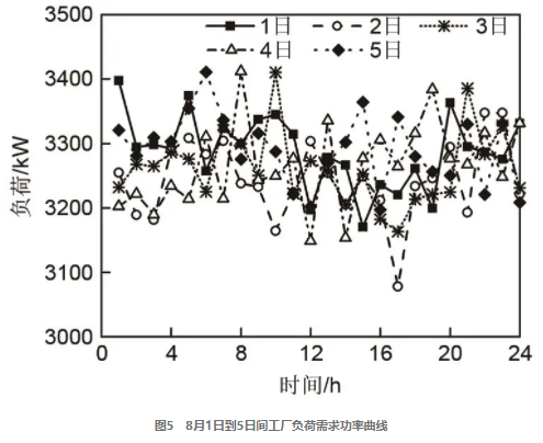 需求側(cè)的電力負(fù)荷是隨機(jī)的和不確定的。為了分析每小時(shí)的負(fù)載需求,收集了2018年一家工廠用戶的歷史負(fù)載數(shù)據(jù),由于設(shè)施維護(hù)需要僅保留有部分?jǐn)?shù)據(jù),其最大和最小負(fù)載需求的值分別為3826 kW和2109 kW。圖5為其2018年8月1日到8月5日間工廠的實(shí)時(shí)負(fù)荷需求功率。