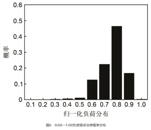 顯然,實(shí)時(shí)負(fù)荷需求是不確定的。為了應(yīng)對(duì)不確定的負(fù)荷需求,相較于文獻(xiàn)使用了模糊聚類理論獲得典型的每小時(shí)負(fù)荷需求。本研究主要通過[17]加權(quán)平均法(WAM)獲得典型的每小時(shí)負(fù)荷需求。圖6描繪了0:00—1:00期間負(fù)荷需求的概率分布。