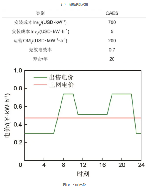 為了驗(yàn)證該模型的準(zhǔn)確性和可靠性,可以利用表3所示參數(shù)進(jìn)行CAES容量配置。其參數(shù)如下,投資利率8%,有效壽命內(nèi)年均工作200天,儲(chǔ)氣罐初始儲(chǔ)量50%,容量范圍限制在10%~90%,CAES系統(tǒng)的圖片和圖片設(shè)定為離散值,在[0,12 MW·h]和[0,12 MW]的范圍內(nèi)以步進(jìn)0.5 MW·h和0.5 MW進(jìn)行尋優(yōu),以配置CAES系統(tǒng)最佳存儲(chǔ)規(guī)模。電網(wǎng)電價(jià)執(zhí)行山西省分時(shí)雙重計(jì)價(jià)如圖10所示。
