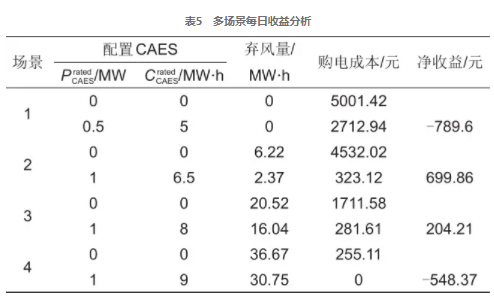 為改善風(fēng)力發(fā)電波動(dòng)性及用戶需求不確定性等問題,本文建立了以最大凈收益為目標(biāo)的優(yōu)化模型,并采用遺傳算法求解了CAES系統(tǒng)最佳存儲(chǔ)規(guī)模,實(shí)現(xiàn)了電力和風(fēng)力間的生產(chǎn)、分配、存儲(chǔ)和轉(zhuǎn)換。同時(shí),利用所建立的模型對(duì)多場(chǎng)景運(yùn)行案例進(jìn)行仿真驗(yàn)證,得到如下結(jié)論。