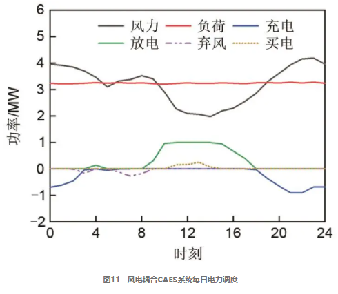 在本研究中,CAES系統(tǒng)中供給用戶側(cè)能量為正,其余為負(fù),即放電功率為正充電功率為負(fù),每日電力調(diào)度情況見圖11。0:00—4:00,20:00—24:00是夜間風(fēng)力較大,同時(shí)考慮到該時(shí)段正處于電網(wǎng)電價(jià)峰谷階段進(jìn)行多余風(fēng)力的存儲(chǔ)更具有經(jīng)濟(jì)價(jià)值,故CAES系統(tǒng)以充電為主;11:00—19:00風(fēng)力輸出不能完全滿足負(fù)荷需求,受限于電網(wǎng)出售電價(jià)較高,該部分負(fù)荷需求主要以CAES系統(tǒng)放電來滿足;從12:00開始,電網(wǎng)售電價(jià)格出現(xiàn)回落,其增加了電網(wǎng)購電的優(yōu)勢(shì)。如上所述,在雙重電價(jià)影響下,CAES系統(tǒng)可以自由的執(zhí)行多余風(fēng)力的存儲(chǔ)和負(fù)荷需求的轉(zhuǎn)移,當(dāng)優(yōu)化模型評(píng)估其利益有損失時(shí)會(huì)增加儲(chǔ)能的釋放。