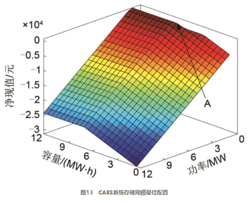 CAES系統(tǒng)存儲(chǔ)規(guī)模配置過程見圖13。該過程嚴(yán)格執(zhí)行2.3節(jié)的求解算法,在系統(tǒng)額定功率和額定容量限定范圍內(nèi)逐步尋優(yōu)。如圖可見,隨著CAES容量的增加,系統(tǒng)總收益先增加后減小,仿真結(jié)果顯示在A點(diǎn)達(dá)到峰值,該點(diǎn)處圖片=1 MW、圖片=6.5 MW·h,其日最大凈利潤(rùn)為699.86元。出現(xiàn)上述變化的原因是:CAES存儲(chǔ)規(guī)模的擴(kuò)大進(jìn)而造成系統(tǒng)投資和運(yùn)行成本大幅度增長(zhǎng),影響了系統(tǒng)經(jīng)濟(jì)效益。