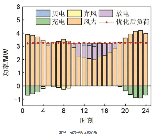 綜上所述,該模型可有效實(shí)現(xiàn)風(fēng)電耦合系統(tǒng)儲(chǔ)能存儲(chǔ)規(guī)模的配置。電力平衡優(yōu)化結(jié)果如圖14所示,其是基于場(chǎng)景2的設(shè)定實(shí)現(xiàn)的。調(diào)度結(jié)果如下:0:00—4:00、20:00—24:00時(shí)間段內(nèi),在滿足用戶負(fù)荷需求后出現(xiàn)了多余風(fēng)力,故通過CAES系統(tǒng)進(jìn)行存儲(chǔ)以減少能量的浪費(fèi);6:00后,CAES系統(tǒng)儲(chǔ)氣罐已達(dá)滿負(fù)荷狀態(tài),其需要在優(yōu)化策略下進(jìn)行適宜調(diào)節(jié),故出現(xiàn)棄風(fēng)量增大現(xiàn)象;10:00開始,風(fēng)力減弱,此時(shí)由風(fēng)力發(fā)電、壓縮空氣儲(chǔ)能、電網(wǎng)協(xié)同運(yùn)行,為用電用戶供電。