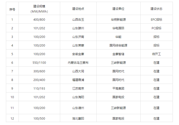 據(jù)公開數(shù)據(jù)統(tǒng)計,國內(nèi)部分待建或在建的大型儲能電站如下表所示,另外,尚有多個大型儲能電站處于前期策劃或開發(fā)階段。