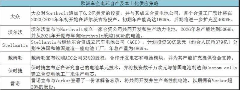 值得注意的是,除了戴姆勒之外,包括大眾、沃爾沃、保時捷、雷諾、Stellantis等多家歐洲主機(jī)廠,也通過入股或合資建廠的方式與歐洲本土電池企業(yè)達(dá)成合作,目的是為其自產(chǎn)電芯尋找合作伙伴,并鎖定部分產(chǎn)能保障其電池供應(yīng)穩(wěn)定。