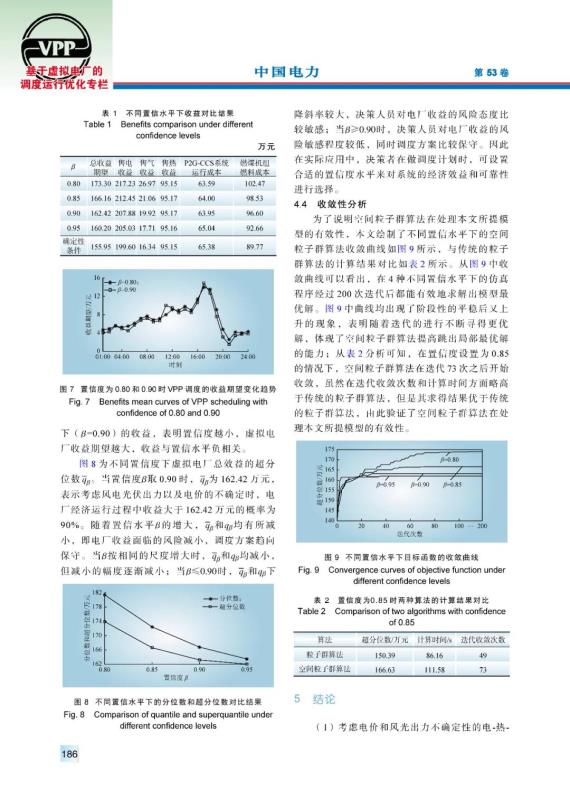 結論:(1)考慮電價和風光出力不確定性的電-熱-氣虛擬電廠隨機優(yōu)化模型所得收益的期望值高于確定性模型,從而降低了確定性模型的調度保守性,使得虛擬電廠有更多的機會獲得更高的經濟效益,更適于其市場行為。(2)電-熱-氣虛擬電廠的收益與置信水平之間存在的負相關關系,更切實地反映了投資領域中的低風險低收益、高風險高收益的特點,電廠決策者可根據(jù)自身風險偏好來權衡風險與收益之間的關系。(3)將虛擬電廠從僅參與電力市場擴展到同時參與電力市場和天然氣市場,有利于獲得更好的經濟效益和調度運行的靈活性。若進一步考慮未來氣價和熱價的隨機性,則可更加反映多種市場的特點。虛擬電廠參與氣電市場的研究方法可擴展至其參與多種市場如電、氣、熱市場、旋轉備用市場等的研究。