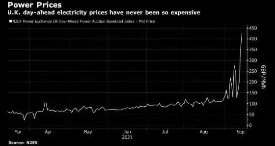 供給的突然減少直接拉高了電價(jià)水平,英國(guó)和歐洲的電價(jià)不斷創(chuàng)下歷史新高。9月15日晚上7-8點(diǎn)的英國(guó)日前電價(jià)甚至沖到了2500英鎊/MWH的水平(大約為22元人民幣/度,這是2020年平價(jià)電價(jià)的70倍)。預(yù)計(jì)8月份的平均英國(guó)家庭電費(fèi)將比正常情況至少高出20%。為了應(yīng)對(duì)高價(jià),EPEX甚至將電力價(jià)格的上限臨時(shí)修改為6000英鎊/MWH。