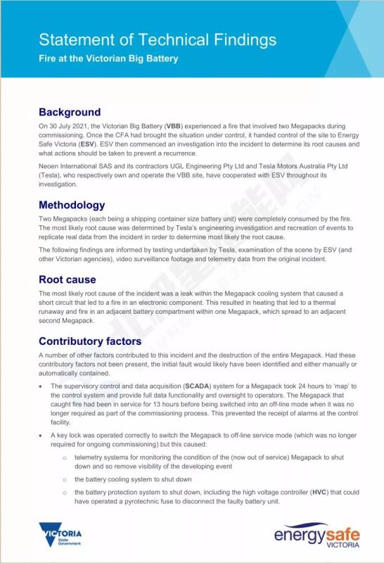 中國儲(chǔ)能網(wǎng)訊:9月28日,澳大利亞維多利州亞州能源安全部門正式發(fā)布了儲(chǔ)能火災(zāi)事故調(diào)查結(jié)果,報(bào)告顯示冷卻系統(tǒng)內(nèi)泄漏造成短路、繼而引發(fā)了儲(chǔ)能火災(zāi)。而監(jiān)控系統(tǒng)沒有按要求24小時(shí)運(yùn)行也是該事故的另內(nèi)在原因。
