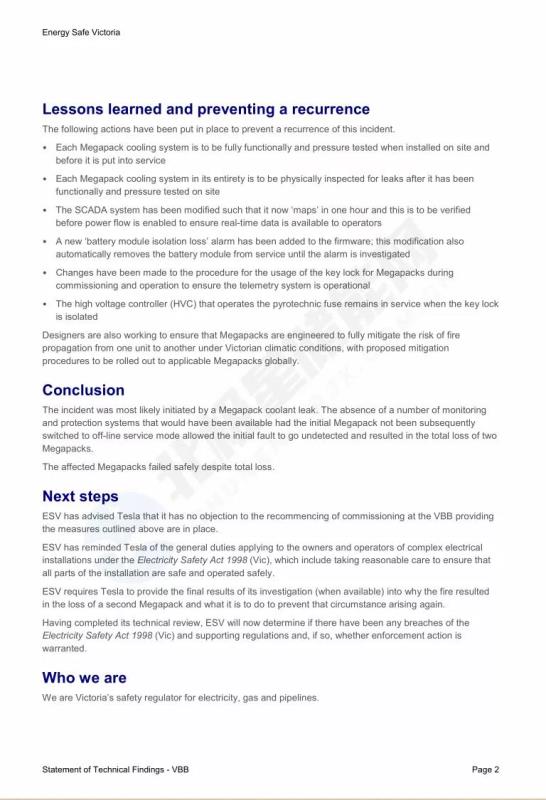 9月28日,維多利亞能源安全局正式發(fā)布了事故調(diào)查結(jié)果報(bào)告。報(bào)告顯示,綜合特斯拉進(jìn)行的詳細(xì)測試、維多利亞能源安全局和其他維多利亞州機(jī)構(gòu)對(duì)現(xiàn)場的檢查、以及視頻監(jiān)控錄像和原始事件的遙測數(shù)據(jù)等,最終得出結(jié)論:事件最可能的根本原因是 Megapack 集裝箱儲(chǔ)能系統(tǒng)冷卻系統(tǒng)內(nèi)泄漏導(dǎo)致短路,并引發(fā)電子元件起火。而局部過熱造成了熱失控,并引燃了同一個(gè)集裝箱內(nèi)與其相鄰的儲(chǔ)能電池,而后火勢又蔓延到相鄰的另一個(gè)集裝箱。