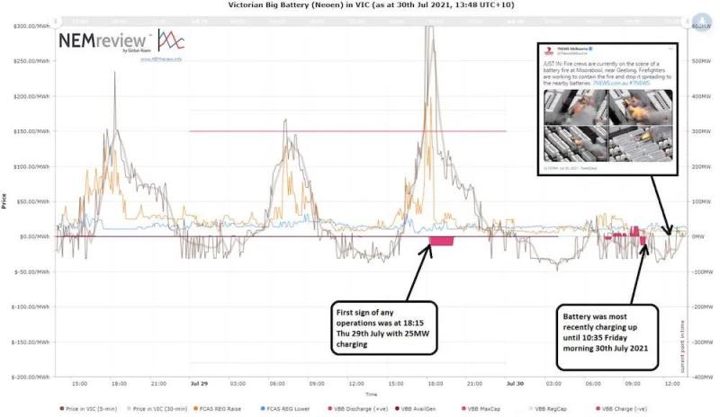 維多利亞儲(chǔ)能項(xiàng)目總裝機(jī)容量300MW/450MWh,此前Neoen與澳大利亞能源市場運(yùn)營商簽訂了一份為期 10 年的合同,主要是提供電力輔助服務(wù)以滿足新南威爾士州和維多利亞州之間的主要電力傳輸?shù)娜萘扛叻逍枨?,原?jì)劃于今年12月投運(yùn)。信息就在火災(zāi)發(fā)生之前的7月29和7月30日早上該項(xiàng)目還進(jìn)行了一些測試。