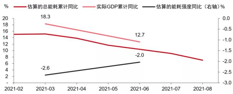 2021年全國能耗控制形勢不容樂觀,呈現(xiàn)總量上升、效率下降趨勢。據(jù)中信證券的測算,總能耗增速下降,但總量仍在增加,能耗強度下降率呈衰減趨勢。2021年前8個月,全國電力能耗、鋼鐵能耗、水泥能耗三項占全國能耗的60%以上,這三個部門是影響年內(nèi)能耗與碳排放控制目標的關鍵。