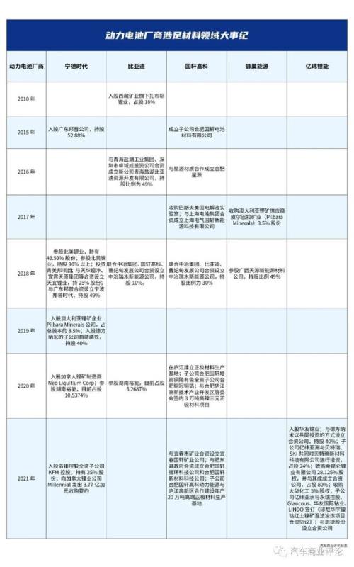 很多電池制造企業(yè),除了與上游的礦業(yè)和中游的材料公司建立牢固、長(zhǎng)久、穩(wěn)定的合作關(guān)系,更是利用資本深入上游產(chǎn)業(yè)鏈之中?;蚴侵苯涌刂频V產(chǎn)資源,或是參股材料生產(chǎn)企業(yè),或是建立合資材料公司,甚至自建材料工廠。