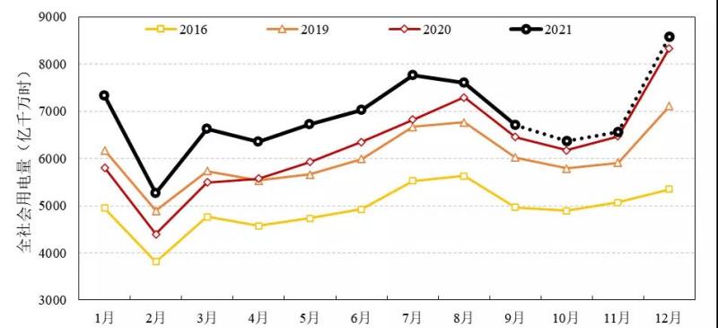 圖2 2021年全社會月度用電量預(yù)測及與近年比較