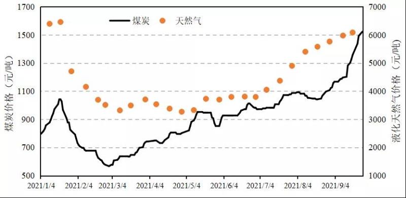 圖1 2021年1-9月份煤炭價格和天然氣價格走勢