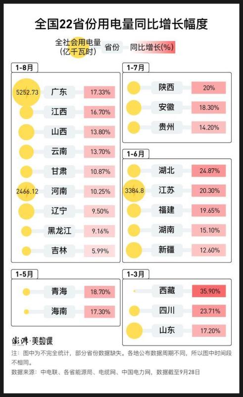 據(jù)不完全統(tǒng)計(jì),今年以來(lái),各地區(qū)用電量同比增幅顯著。其中,西藏、湖北、四川、江蘇和陜西的同期用電量增幅均超過(guò)20%。