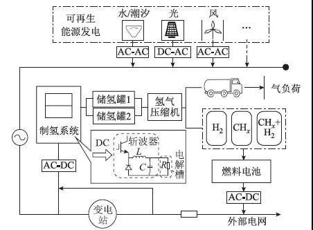 風(fēng)光氫儲系統(tǒng)主要由風(fēng)力發(fā)電機(jī)組、太陽能光伏電池組、控制/轉(zhuǎn)化單元、儲能裝置、逆變器、電解槽等部分組成。具體流程為來自光伏陣列和風(fēng)力發(fā)電機(jī)組的直流電源通過控制器將多余的能量儲存到儲能裝置中,然后經(jīng)由逆變器轉(zhuǎn)換成交流電,用于電解水制氫。電能通過電解水制氫設(shè)備轉(zhuǎn)化成氫氣,將氫氣輸送至氫氣應(yīng)用終端或經(jīng)燃料電池并入電網(wǎng)中,完成從可再生能源到氫能的轉(zhuǎn)化??刂?轉(zhuǎn)化單元是整套系統(tǒng)最重要的部分。控制/轉(zhuǎn)化單元根據(jù)收集的實(shí)時信息對上網(wǎng)功率、制氫功率及燃料電池發(fā)電功率進(jìn)行決策,是保證系統(tǒng)安全可靠穩(wěn)定運(yùn)行的基礎(chǔ)。