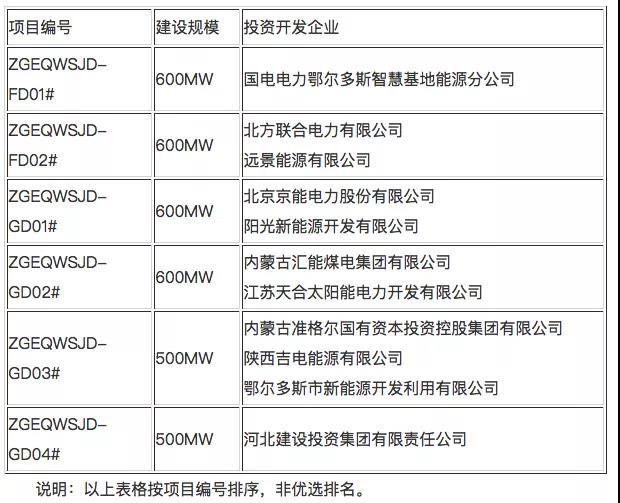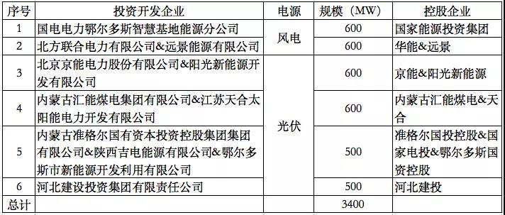 根據(jù)優(yōu)選結(jié)果來看,中標(biāo)企業(yè)多數(shù)以聯(lián)合體形式中標(biāo),國家能源投資集團、華能&遠(yuǎn)景各拿下600MW的風(fēng)電項目。京能&陽光新能源、內(nèi)蒙古匯能煤電&天合各中標(biāo)600MW的光伏項目,準(zhǔn)格爾國投&國家電投&鄂爾多斯國投、河北建投則各中標(biāo)500MW的光伏項目。具體結(jié)果見下:
