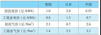 表1美國、日本和中國典型電價(jià)氣價(jià)