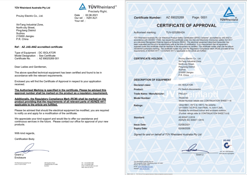 早在8月初,蘇州普兆新能源設備有限公司(簡稱“普兆”)PEDS16-55A( 300V~1500V)全部系列直流隔離開關通過澳大利亞AS 60947.3:2018和 AS/NZS IEC 60947.1:2015標準測試,率先獲得TüV萊茵澳大利亞本土認證,這是國內首家獲得澳洲本土認證的隔離開關品牌!