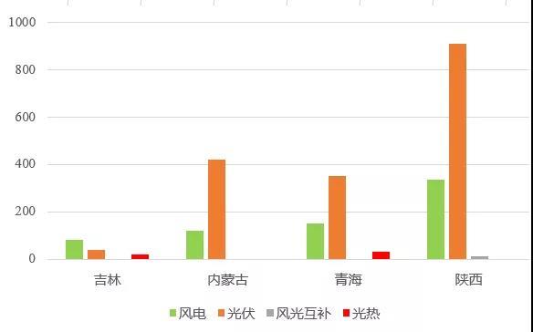 其中,陜西省規(guī)模最大,達到1253萬千瓦,吉林省規(guī)模較小,為140萬千瓦。內(nèi)蒙古、青海分別為540萬千瓦、530萬千瓦,四省各類項目規(guī)模分布如下圖所示。