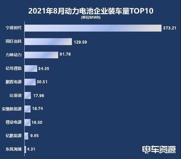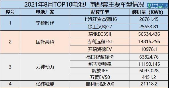 8月在新能源物流車(chē)領(lǐng)域,動(dòng)力電池裝車(chē)量排名前10位的分別是:寧德時(shí)代、國(guó)軒高科、力神動(dòng)力、億緯鋰能、鵬輝電源、比亞迪、安馳新能源、鋰動(dòng)電源、億鵬能源、東風(fēng)海博。