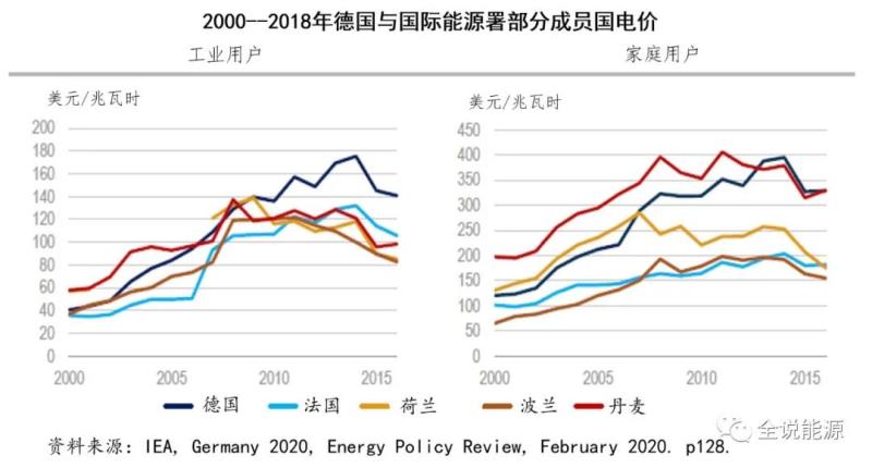 我們知道的是,為了推進能源轉(zhuǎn)型,德國花費了巨額的財政支出,其中自2000年以來,德國在能源轉(zhuǎn)型過程中的稅收減免和可再生能源補貼總支出就超過了2430億歐元。羊毛當然是出在羊身上,這些巨額的財政支出最終都轉(zhuǎn)嫁給了德國的普通百姓。因為征稅、收費和稅收,包括用于支付可再生能源補貼的稅收,德國消費者支付的電價在國際能源署成員國中是最高的。2018年,盡管能源密集型行業(yè)的價格大幅下降,但德國在國際能源署成員國中工業(yè)電價排名第三,其中稅收占整個工業(yè)電價的48%,是國際能源署成員國中最高的;家庭用戶支付的總電價中,大約一半是公共費用,僅次于丹麥,排名第二。