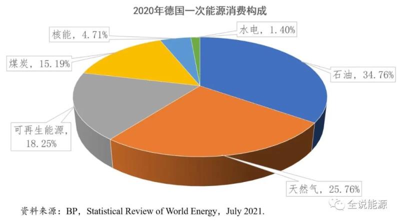 具體細分,德國的能源消費高度依賴傳統(tǒng)的化石能源。2020年,德國一次能源消費結(jié)構(gòu)中,石油是第一大能源來源,占比34.76%;天然氣第二,占比25.76%;可再生能源第三,占比18.25%;煤炭第四,占比15.19%;核能第五,占比4.71%;水電第六,占比1.4%。