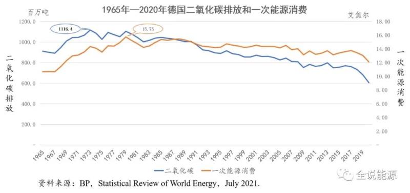 從統(tǒng)計數(shù)字看,德國能源消費產(chǎn)生的二氧化碳排放量最高的年份,是49年前的1973年,為11.164億噸,自此之后就再也沒有超過這個數(shù)字。因此,可以說,早在約50年前德國就已經(jīng)實現(xiàn)了碳達峰,德國能源消費的二氧化碳達峰,與后來逐漸大熱的氣候問題和減排,沒有任何直接的關(guān)系。