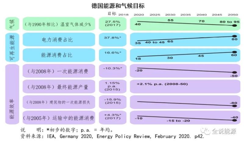 綜合上述有關(guān)文件,為了實現(xiàn)能源轉(zhuǎn)型,德國政府計劃,以2008年為基準,2020年德國一次能源消費要下降20%,2050年要下降50%;以1990年為基準,2020年德國溫室氣體排放要下降40%,2030年要下降55%,2050年要下降80-95%;來源于可再生能源的發(fā)電,2020年至少要達到35%,2030年要達到50%,2040年要達到65%,2050年要達到80%。