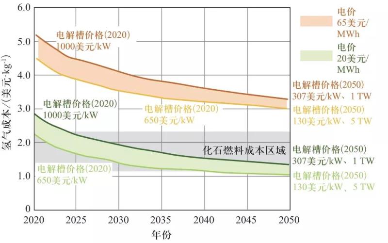 ? 圖2 2020—2050年期間綠氫成本變化趨勢(shì)