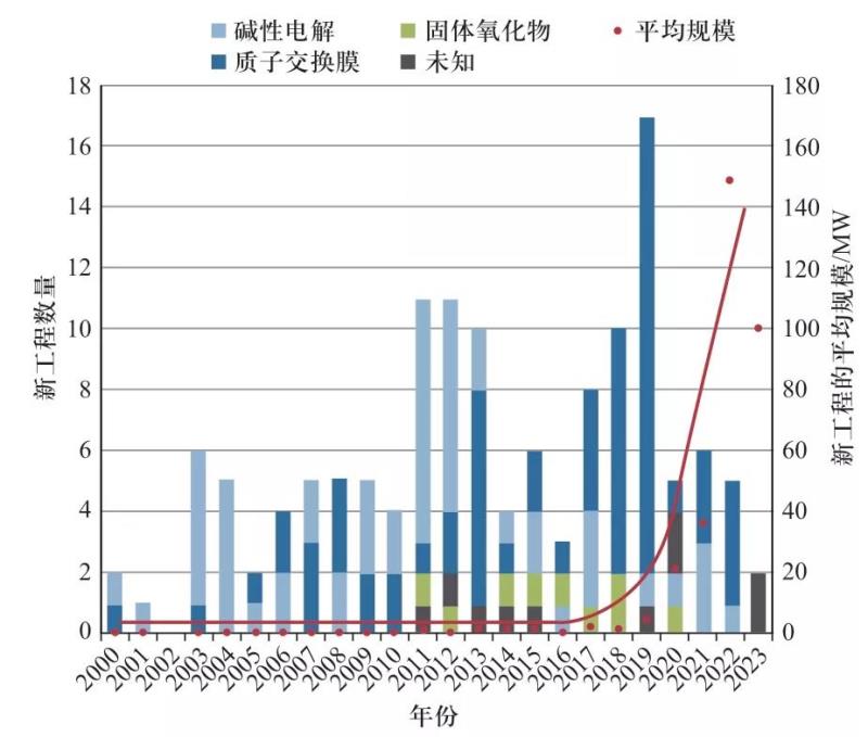 ? 圖1 各國(guó)電解制氫項(xiàng)目時(shí)間及項(xiàng)目規(guī)模變化圖