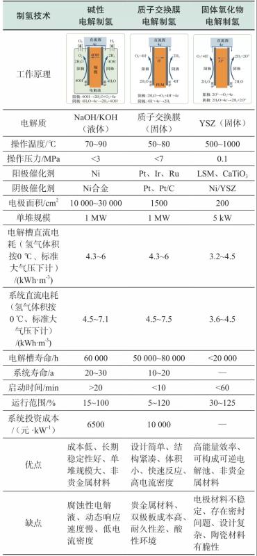 電解水的電化學(xué)反應(yīng)過(guò)程被認(rèn)為是完全清潔的產(chǎn)氫過(guò)程,無(wú)二氧化碳排放。電解制氫技術(shù)主要分為3種:堿性電解(AWE),質(zhì)子交換膜(PEM)電解,固體氧化物電解(SOEC)。表1總結(jié)了3種技術(shù)的重要特征及優(yōu)缺點(diǎn)。