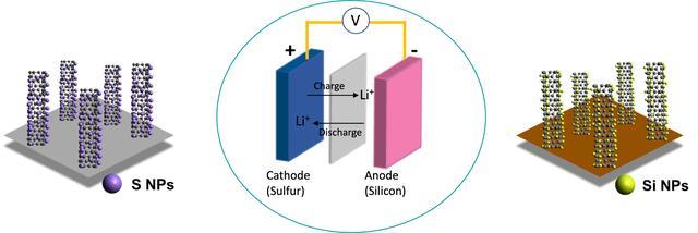 HIPERSSYS使用垂直排列的碳納米管為架構(gòu)來沉積電極中的活性物質(zhì)。垂直排列的碳納米管確保了與基片更好的接觸和粘附,從而增加了離子擴(kuò)散率,并改善了電子傳輸特性,從而使充放電速率得到改善。此外,垂直排列的碳納米管和基片之間的緊密接觸提供了一個(gè)低電阻通道,使整個(gè)電極有效連接。垂直排列的碳納米管表具有大表面積的多孔結(jié)構(gòu),會(huì)大大促進(jìn)化學(xué)傳輸和界面反應(yīng)。垂直排列的碳納米管的這些特性(規(guī)則的孔隙結(jié)構(gòu)、高表面積和優(yōu)異的導(dǎo)電性)使它們成為電極或電流收集器的候選材料,提高鋰離子電池的性能。