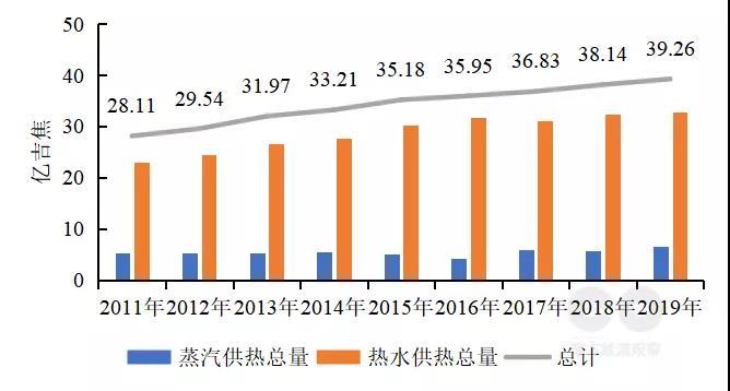 盡管城鎮(zhèn)供熱面積在持續(xù)增加,隨著供熱效率的改進(jìn),近十年來全國(guó)供熱需求總量增長(zhǎng)緩慢(圖8)。2019年,全國(guó)城市集中供熱總量為39.26億吉焦,其中蒸汽供熱總量約為6.5億吉焦,同比增長(zhǎng)12.71%;熱水供熱總量約為32.7億吉焦,同比增長(zhǎng)1.18%?!笆奈濉逼陂g節(jié)能高效的燃煤熱電聯(lián)產(chǎn)機(jī)組是集中供熱技術(shù)的主要發(fā)展方向,燃?xì)鉄犭娐?lián)產(chǎn)集中供熱區(qū)域與城市熱網(wǎng)結(jié)合,承擔(dān)供熱調(diào)峰功能、大型區(qū)域供熱鍋爐將成為重要補(bǔ)充,分散供熱鍋爐將被淘汰。由此判斷“十四五”期間每年需要約60.5億吉焦的熱量來滿足集中供熱需求。2019年電力集中供暖能耗約2.01億噸標(biāo)準(zhǔn)煤,預(yù)計(jì)2025年達(dá)到3.2億噸標(biāo)準(zhǔn)煤。