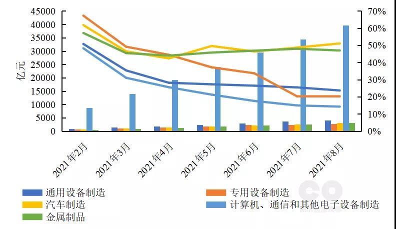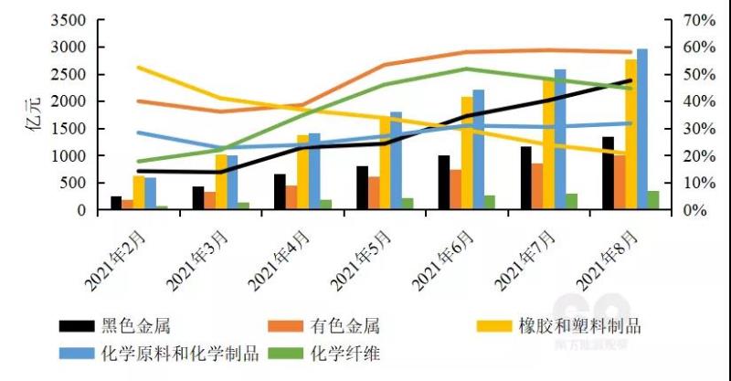 我國(guó)疫情防控進(jìn)度領(lǐng)先全球,對(duì)其他國(guó)家的出口替代拉動(dòng)出口高速增長(zhǎng),但與年初相比持續(xù)放緩。2021年1-8月我國(guó)累計(jì)出口總值2.1萬億美元,同比增長(zhǎng)33.7%,進(jìn)出口差額累計(jì)為3624億美元,同比增長(zhǎng)25.4%(圖3)。從出口替代的主要商品來看,非高耗能制造業(yè)方面,2021年1-8月通用設(shè)備、專用設(shè)備、金屬制品、汽車制造和計(jì)算機(jī)、通信和其他電子設(shè)備累計(jì)出口交貨值同比增長(zhǎng)分別為23.7%、20.3%、51.1%、47%、14.3%(圖4);高耗能制造業(yè)方面,2021年1-8月黑色金屬冶煉、有色金屬橡膠和塑料制品、化學(xué)纖維制品、化學(xué)原料和化學(xué)制品累計(jì)出口交貨值同比增長(zhǎng)分別為47.5%、58%、20.5%、44.6%、31.7%(圖5)。